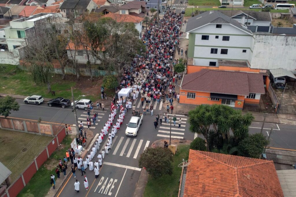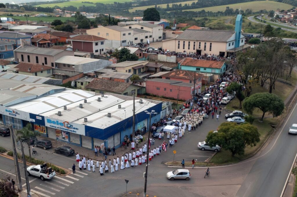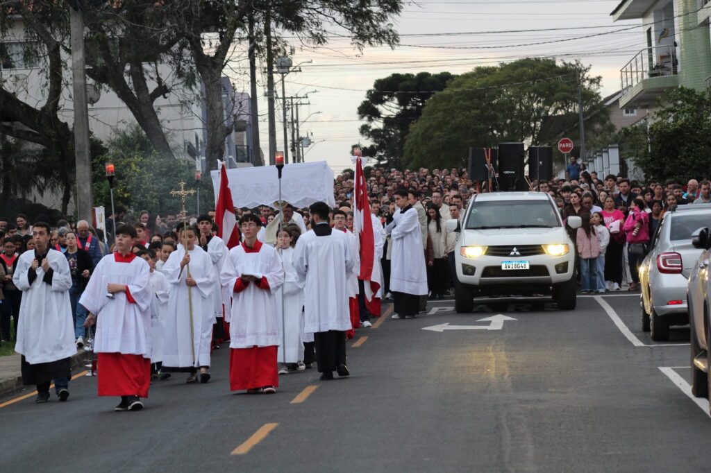 Após a Missa, teve início a procissão pelas ruas de Carambeí, que seguiu pela Avenida do Ouro, especialmente fechada para o momento de fé e adoração pública. O clima ensolarado e ameno, incomum para o mês de junho, favoreceu a participação em massa da comunidade, que lotou as ruas com cânticos, orações e demonstrações de fé.