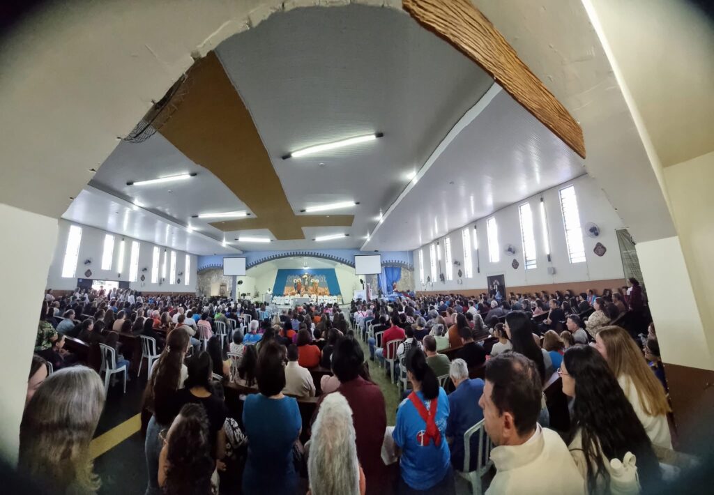 Com a igreja completamente lotada, a paróquia instalou um telão no Salão Paroquial, permitindo que mais pessoas acompanhassem a celebração com respeito e fé.