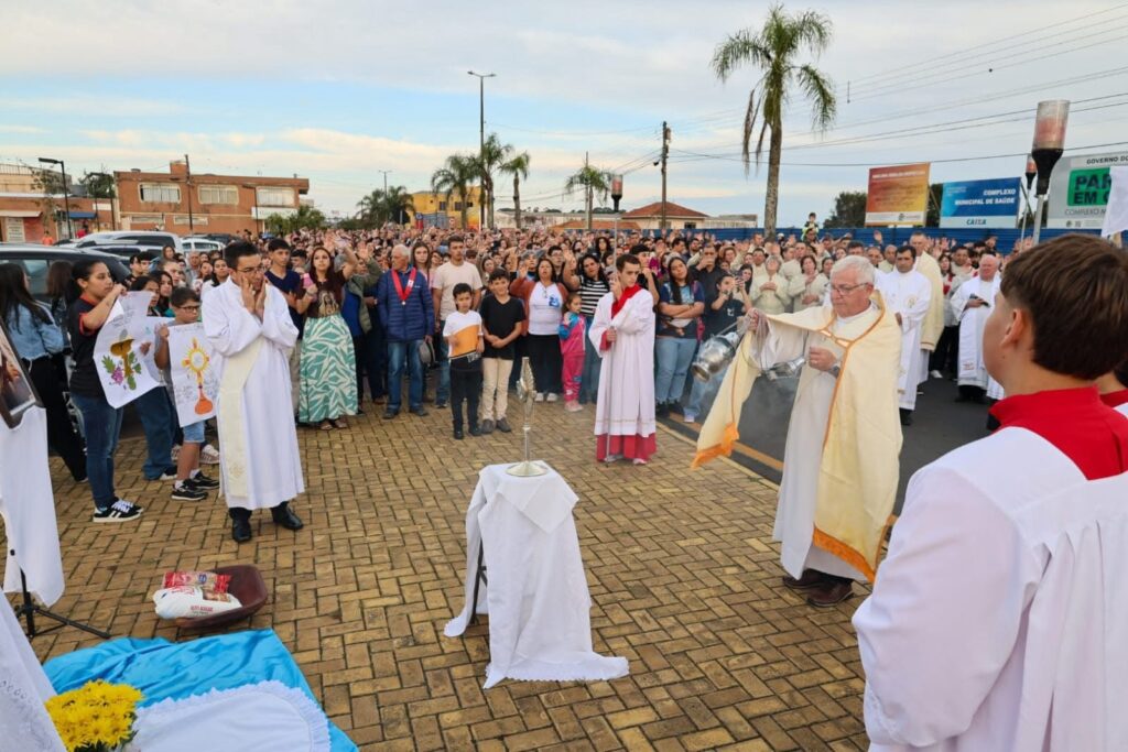 A tradicional solenidade de Corpus Christi emocionou os fiéis de Carambeí nesta quinta-feira (19), reunindo uma grande multidão em um dos momentos mais marcantes do calendário litúrgico. A celebração teve início às 15h, com a Santa Missa na Igreja Matriz da Paróquia Imaculada Conceição, presidida pelo pároco Padre Jorge, com o auxílio dos diáconos da paróquia.