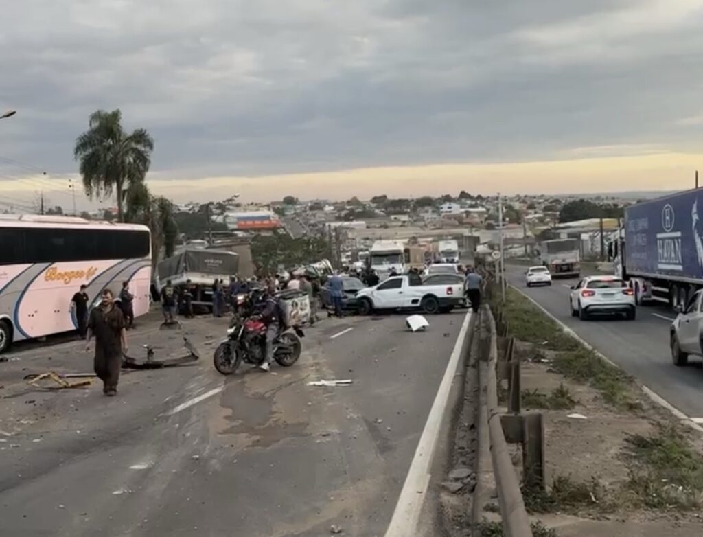 Um grave acidente de trânsito mobilizou diversas equipes de emergência na tarde desta quinta-feira (17), por volta das 17h, no km 488 da BR-376, em Ponta Grossa. A ocorrência envolveu ao menos nove veículos, incluindo três caminhões e cinco automóveis, além de um ponto de ônibus atingido.