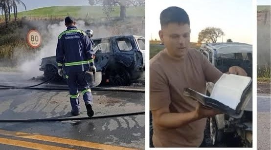 Homem faz vídeo e mostra bíblia intacta após carro destruído por incêndio na região