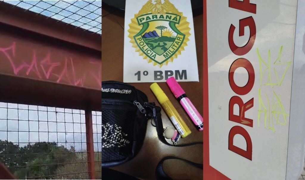 A Polícia Militar de Carambeí atendeu na tarde deste domingo (7) uma ocorrência de pichação na passarela localizada sobre a Rodovia PR-151, na Rua das Águas Marinhas.