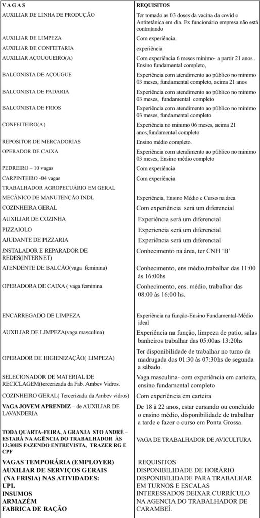 Nesta quarta-feira, 17 de setembro, a Agência do Trabalhador de Carambeí anuncia novas vagas de emprego em diversas áreas. As oportunidades reforçam o compromisso do município em facilitar o acesso da população ao mercado de trabalho e apoiar quem busca recolocação profissional.