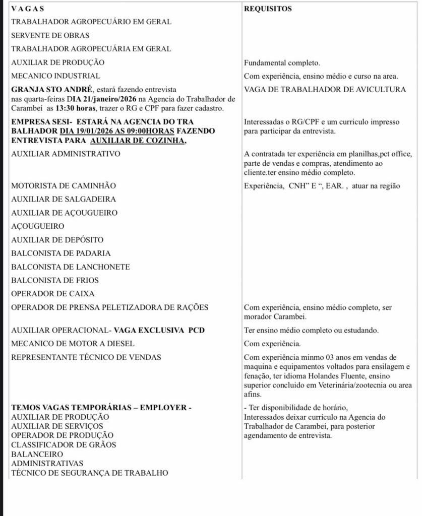 Nesta segunda-feira, 19 de janeiro, a Agência do Trabalhador de Carambeí anuncia novas vagas de emprego em diversas áreas. As oportunidades reforçam o compromisso do município em facilitar o acesso da população ao mercado de trabalho e apoiar quem busca recolocação profissional.