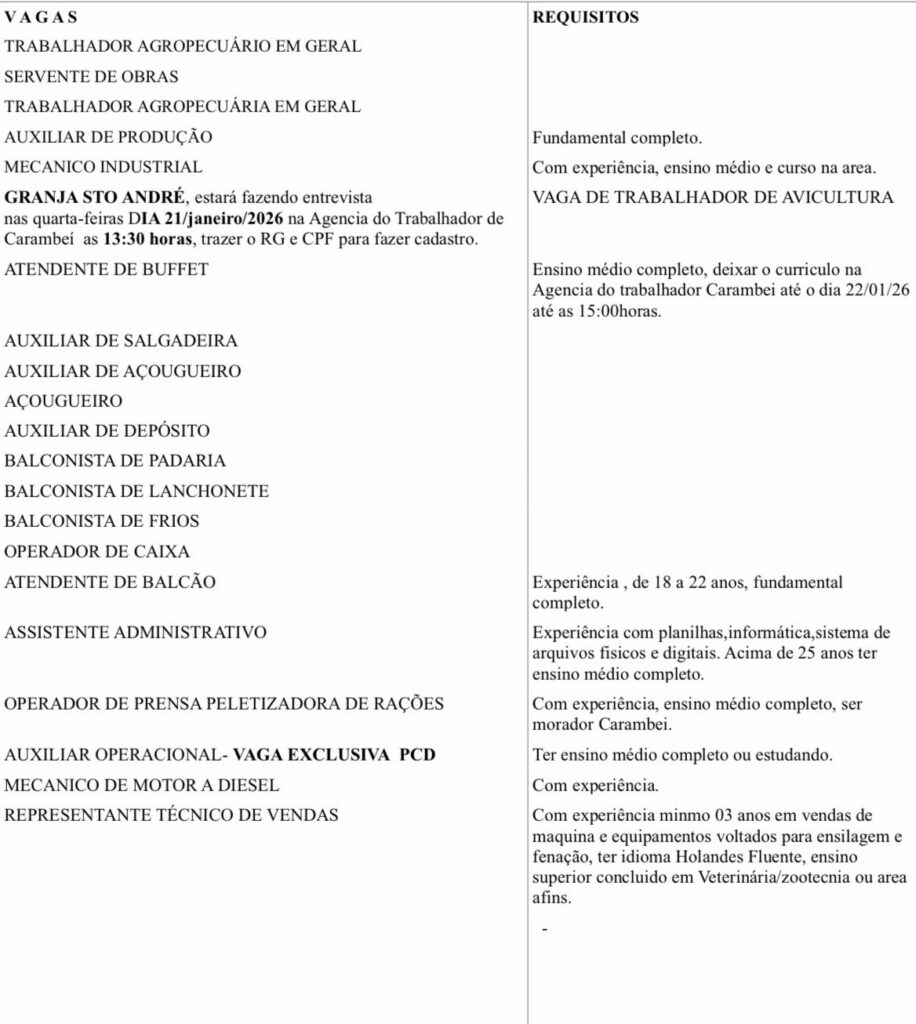 Nesta quinta-feira, 22 de janeiro, a Agência do Trabalhador de Carambeí anuncia novas vagas de emprego em diversas áreas. As oportunidades reforçam o compromisso do município em facilitar o acesso da população ao mercado de trabalho e apoiar quem busca recolocação profissional.