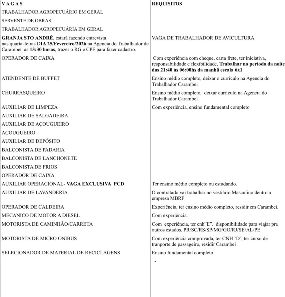 Nesta quinta-feira, 19 de fevereiro, a Agência do Trabalhador de Carambeí anuncia novas vagas de emprego em diversas áreas. As oportunidades reforçam o compromisso do município em facilitar o acesso da população ao mercado de trabalho e apoiar quem busca recolocação profissional.