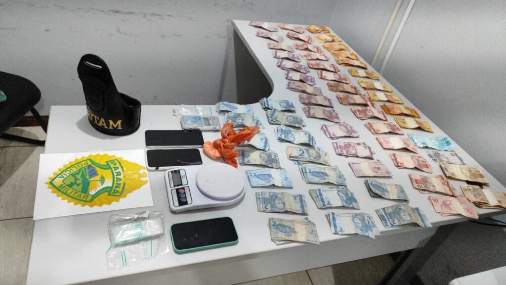 Na abordagem, foram localizadas porções de substâncias análogas à cocaína e crack, quantia em dinheiro, balança de precisão, aparelhos celulares e objetos comumente utilizados para fracionamento e comercialização de entorpecentes.