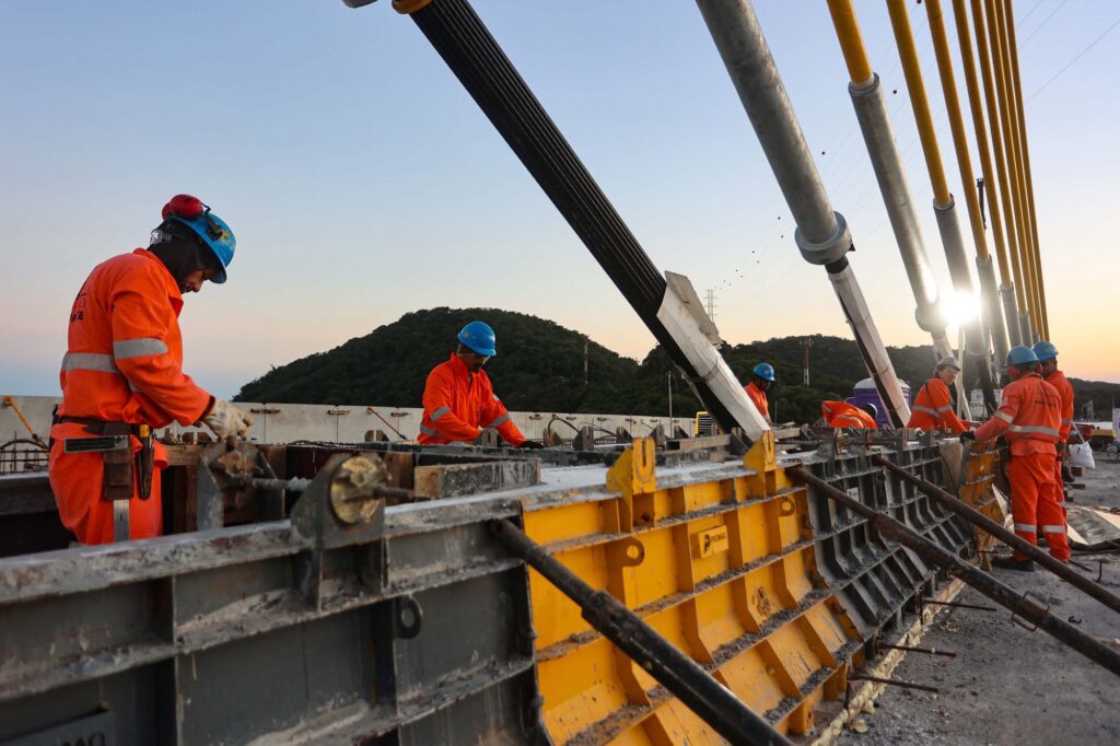 Além da evolução das aduelas, fevereiro também marcou a conclusão da instalação dos 12 pares de estais em cada um dos mastros dos apoios 04 e 05. Os estais, cabos de aço de alta resistência, são responsáveis por sustentar o tabuleiro no trecho central e garantem a estabilidade da estrutura. A finalização dessa etapa representa um avanço simbólico e técnico, consolidando a configuração definitiva da ponte sobre a baía.