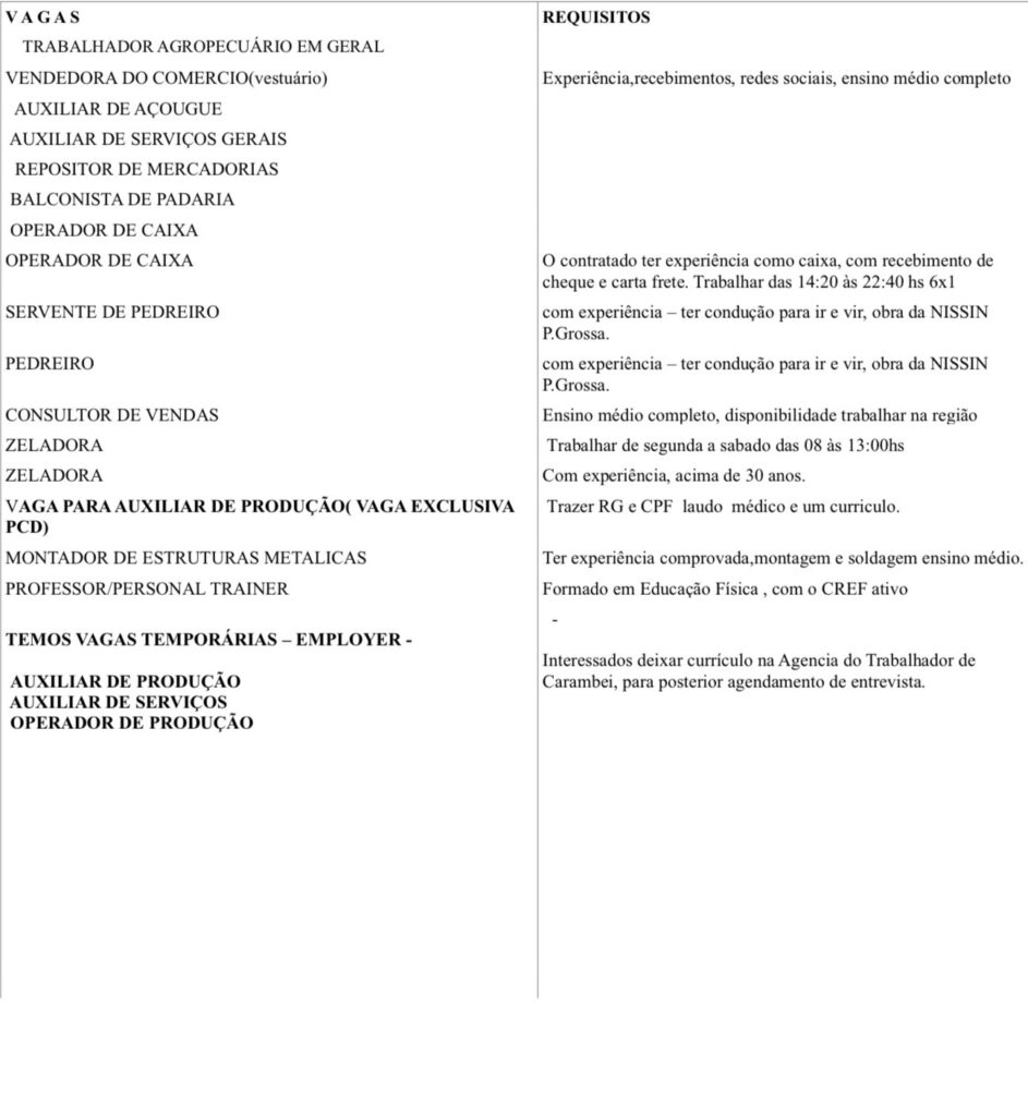 Nesta terça-feira, 7 de abril, a Agência do Trabalhador de Carambeí anuncia novas vagas de emprego em diversas áreas. As oportunidades reforçam o compromisso do município em facilitar o acesso da população ao mercado de trabalho e apoiar quem busca recolocação profissional.