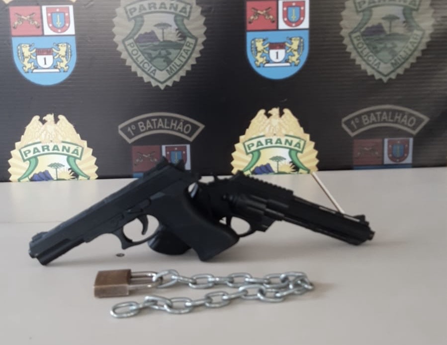 Em buscas na residência, foram localizados dois simulacros de arma de fogo, utilizados nas ameaças relatadas pelas vítimas.