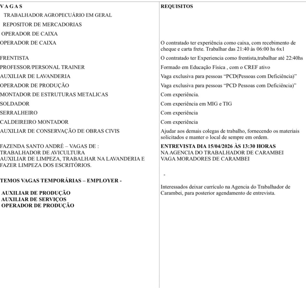 Nesta quinta-feira, 15 de abril, a Agência do Trabalhador de Carambeí anuncia novas vagas de emprego em diversas áreas. As oportunidades reforçam o compromisso do município em facilitar o acesso da população ao mercado de trabalho e apoiar quem busca recolocação profissional.