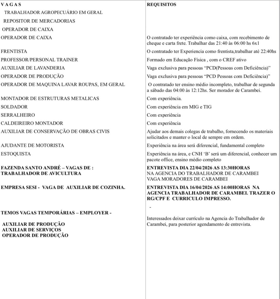 Nesta quinta-feira, 16 de abril, a Agência do Trabalhador de Carambeí anuncia novas vagas de emprego em diversas áreas. As oportunidades reforçam o compromisso do município em facilitar o acesso da população ao mercado de trabalho e apoiar quem busca recolocação profissional.