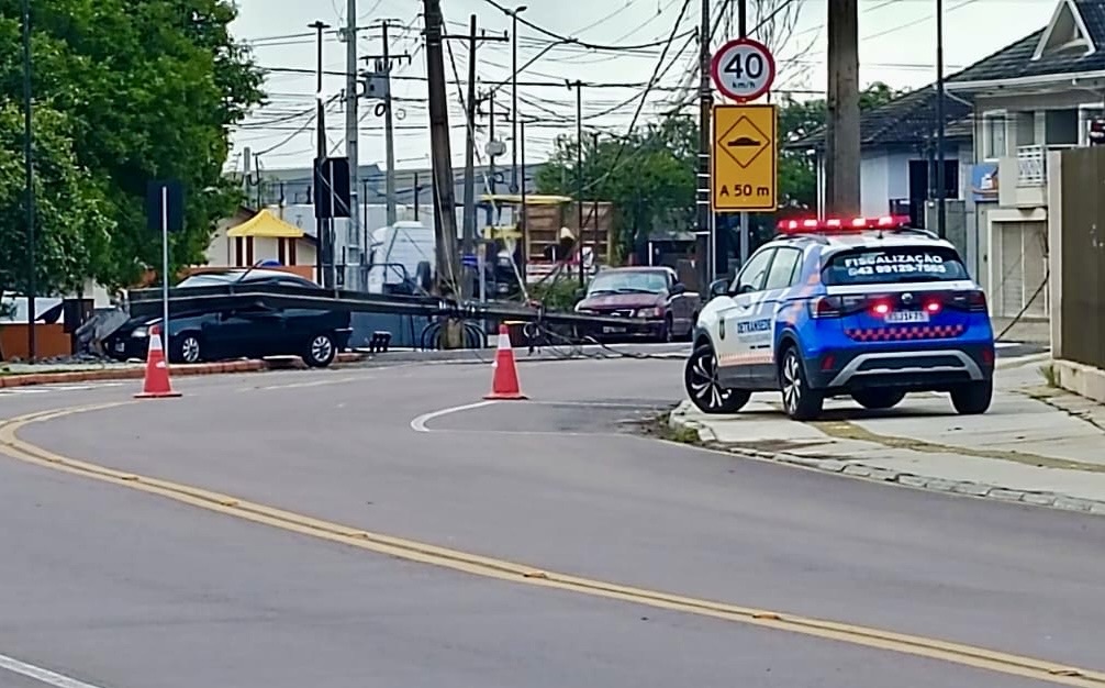 Carro derruba poste e interdita Avenida das Flores em Carambeí
