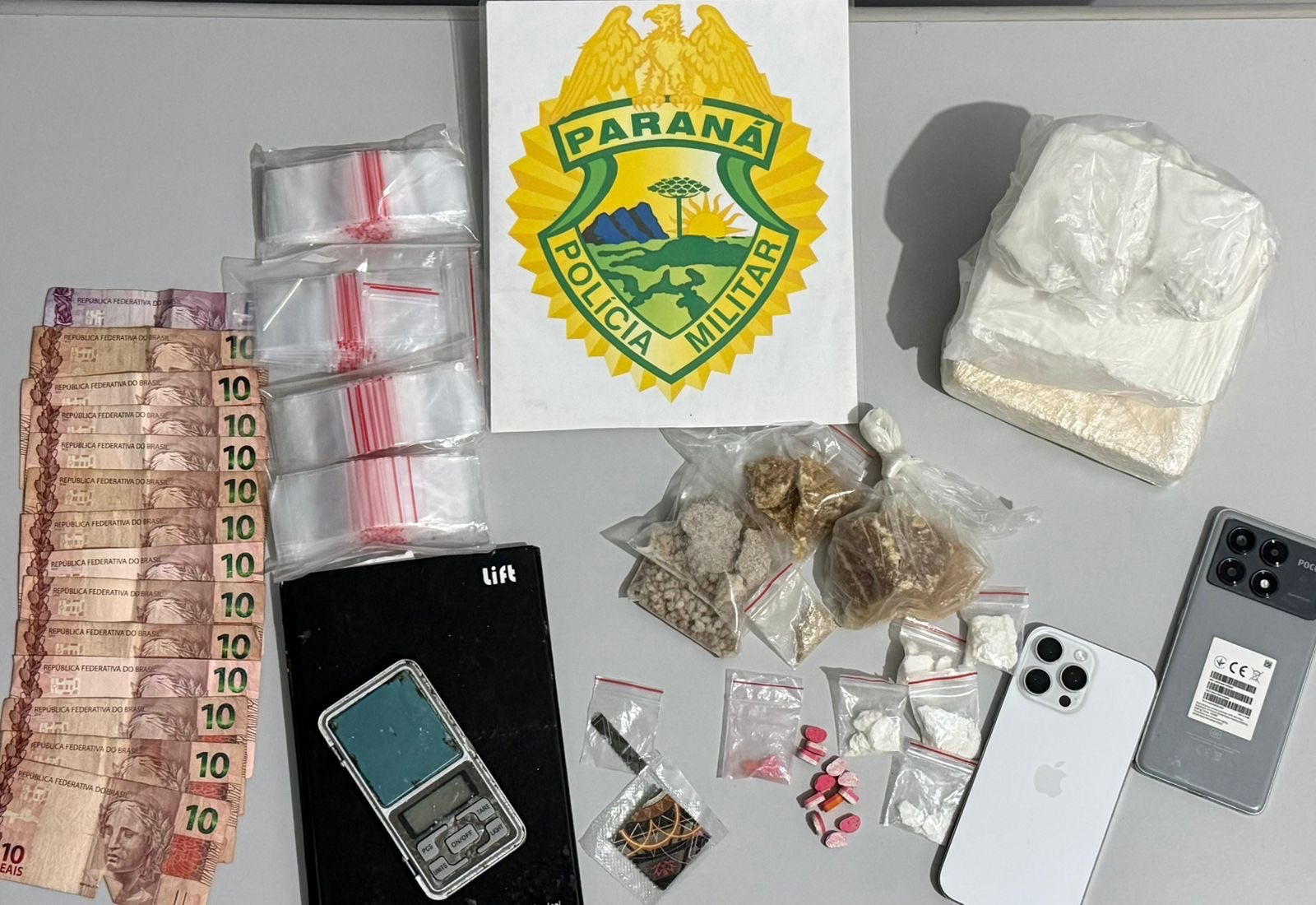 Um homem de 29 anos foi preso em flagrante por tráfico de drogas na noite desta sexta-feira (24), em Castro, após uma ação da Polícia Militar. A ocorrência foi registrada por volta das 19h30, quando os policiais abordaram o suspeito que tentou fugir em um automóvel de cor branca. Durante a revista, os militares encontraram porções de cocaína e de crack. O homem confessou que o entorpecente seria destinado à comercialização. Na sequência da ação, os policiais localizaram e apreenderam aproximadamente 1,3 kg de cocaína, cerca de 100 gramas de crack, duas unidades de LSD, além de quantidades de MD e ecstasy. Também foram apreendidas embalagens tipo zip lock, utilizadas para fracionamento da droga, uma balança de precisão, R$ 135,00 em dinheiro e dois celulares. O suspeito foi conduzido à delegacia juntamente com os entorpecentes e materiais apreendidos para as demais providências legais.