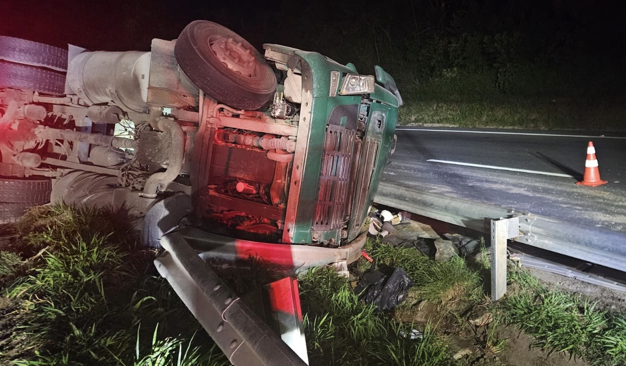 Um grave acidente de trânsito resultou na morte de um homem de 73 anos na noite de ontem, quinta-feira (19). O caminhão que ele conduzia acabou tombando após perder o controle da direção, provocando grande mobilização das equipes de emergência. O acidente ocorreu por volta das 23h, no km 439 da BR-376, no município de Ipiranga, nos Campos Gerais do Paraná. O veículo, um Volvo/FH 440, emplacado em São José dos Pinhais, seguia no sentido Norte, após sair daquele município com destino a Ortigueira, quando tombou sobre o guard rail metálico e o canteiro central da rodovia. Com o impacto, o condutor não resistiu aos ferimentos e entrou em óbito ainda no local. O caminhão transportava defensivos agrícolas em contêiner. Apesar da gravidade do acidente, não houve rompimento da estrutura de carga, que permaneceu intacta. Equipes da Polícia Rodoviária Federal (PRF), da concessionária responsável pelo trecho, além da Polícia Civil, Perícia Científica e Instituto Médico-Legal (IML), estiveram no local para os procedimentos necessários. A rodovia não precisou ser interditada e o tráfego seguiu normalmente durante o atendimento da ocorrência.