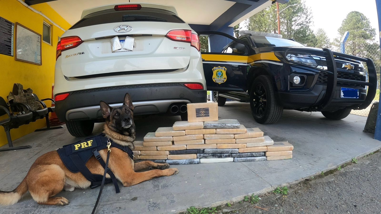 A Polícia Rodoviária Federal apreendeu na manhã de hoje (08) 54,9 kg de cocaína durante fiscalização na BR-277. A droga estava escondida em compartimento oculto de um Hyundai Santa Fé, com placas do Paraguai, ocupado por um casal de estrangeiros. Durante a abordagem, o casal afirmou que viajava a Curitiba para comprar roupas para a loja que possui no país vizinho. No entanto, as respostas contraditórias levantaram suspeita, e a equipe utilizou cães farejadores, que indicaram a presença de ilícitos na parte traseira do veículo, após fiscalização minuciosa, a equipe localizou diversos tabletes da droga em compartimento ocultos nas laterais traseiras e nas quatro portas. O condutor relatou ter sido contratado para levar a droga de Ciudad del Este até Curitiba, a passageira, grávida de sete meses, disse desconhecer a existência da cocaína. O casal foi detido e, junto com os materiais apreendidos, encaminhado à Polícia Federal.