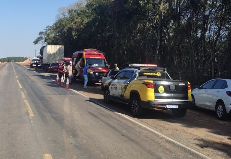 Um acidente envolvendo quatro veículos foi registrado na tarde desta quinta-feira (21 de agosto de 2025), na PR-151, em Ponta Grossa, no trecho próximo ao Rio Caniú, entroncamento com a PR-438, sentido Teixeira Soares. De acordo com a Polícia Rodoviária Estadual (BPRv), o acidente ocorreu por volta das 14h e deixou um homem de 27 anos com ferimentos leves. Ele conduzia uma Fiat Strada, com placas de Ponta Grossa, e foi socorrido pelo SIATE, sendo encaminhado à UPA Santa Paula. Os demais veículos envolvidos foram: Um caminhão DAF XF105, também de Ponta Grossa, conduzido por um homem de 43 anos, sem ferimentos. Um semirreboque SR Pastre, acoplado ao caminhão DAF. Um Mercedes-Benz Atron 1318, com placas de Erechim (RS), conduzido por um homem de 25 anos, que também não se feriu. Segundo a apuração da polícia, o condutor da Strada tentava realizar uma ultrapassagem quando acabou sendo atingido na traseira pelo caminhão Mercedes-Benz. Com o impacto, o veículo ainda colidiu contra a traseira do semirreboque. Os veículos tiveram danos de pequena monta e foram liberados no local aos responsáveis, sem pendências administrativas.