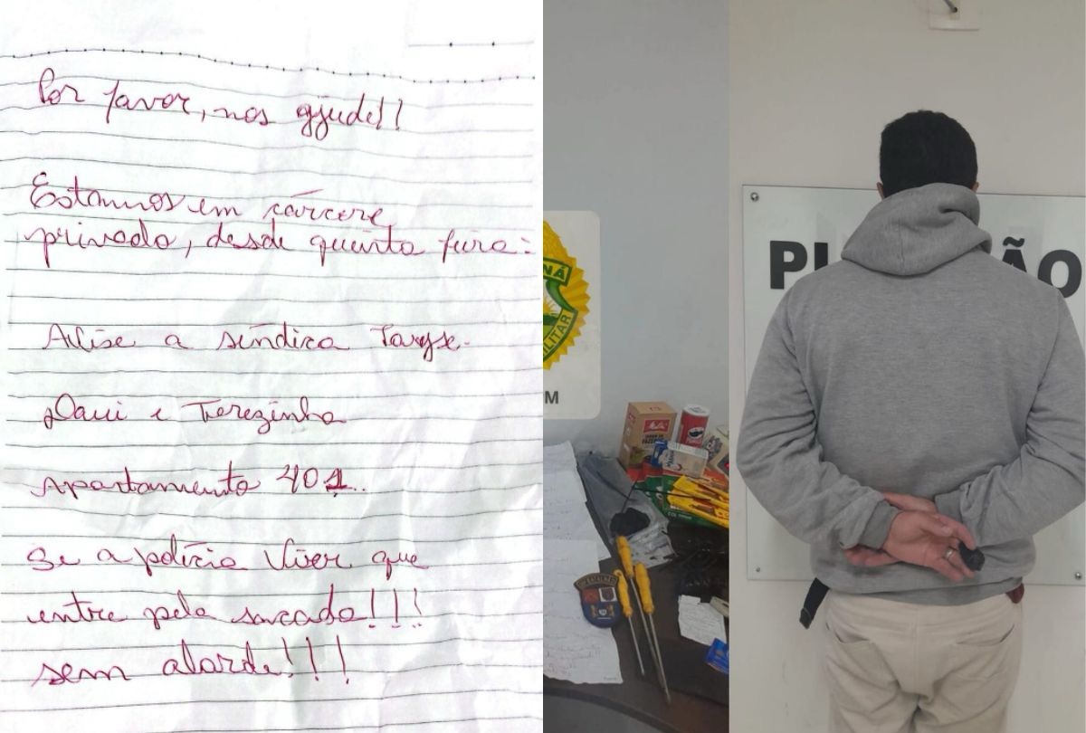 Um caso de cárcere privado em Pinhais, na Região Metropolitana de Curitiba (RMC), terminou com um homem preso em flagrante. As vítimas, mãe e filha, foram resgatadas após conseguirem escrever bilhetes pedindo socorro. De acordo com a Polícia Civil, elas escreveram os bilhetes enquanto o homem dormia entre a noite de sexta-feira (11) e a madrugada de sábado (12). Depois, os recados foram jogados pela sacada do apartamento onde elas estavam. Cárcere privado em Pinhais Na sequência, um vizinho encontrou um dos bilhetes na manhã de sábado e acionou a Polícia Militar (PM). O suspeito, identificado como Glauber Gandra Severino, foi preso em flagrante no mesmo dia pelo cárcere privado em Pinhais. Conforme as vítimas, o suspeito teve um relacionamento com uma prima delas e morou no prédio em 2023. Ele entrou no apartamento na quinta-feira (10) e deixou mãe e filha amarradas em um quarto. Mãe e filha são resgatadas após jogarem bilhete pela janela Ao serem mantidas em cárcere privado, as vítimas relataram que o homem as obrigou a preencher dois cheques. O suspeito também pegou cartões bancários. De acordo com a polícia, mãe e filha estavam amarradas com abraçadeiras plásticas. O homem, ao escutar os agentes, tentou fugir e pulou para o apartamento vizinho. As equipes entraram no apartamento do vizinho e encontraram o suspeito, que foi preso pelo cárcere privado em Pinhais. A ação também contou com a ajuda de outro vizinho, que também é policial militar.
