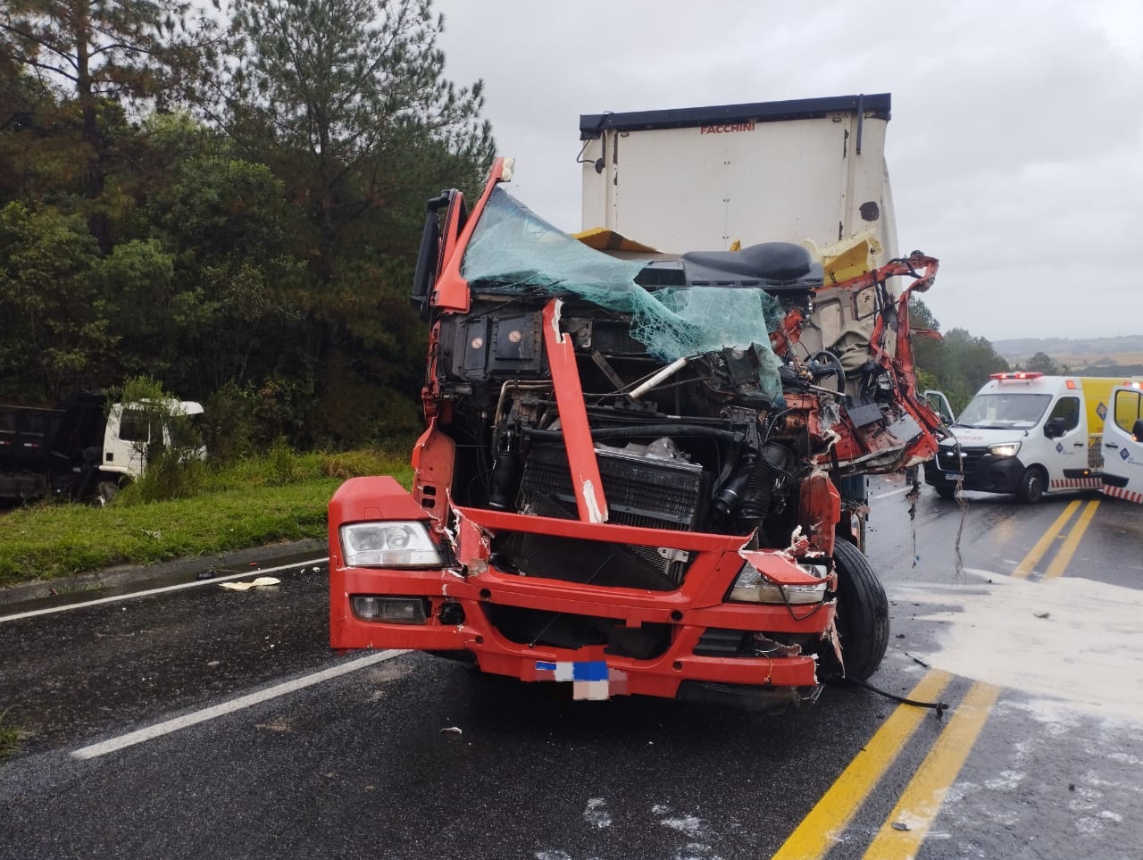 Grave colisão entre dois caminhões e um carro bloqueia rodovia na região