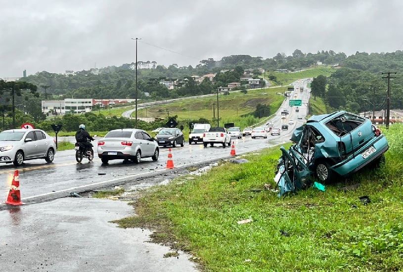 Um acidente no Contorno Norte, envolvendo um carro e um caminhão, terminou com a morte de uma pessoa na manhã desta segunda-feira (9). A batida aconteceu na divisa entre Almirante Tamandaré e Curitiba. De acordo com o sargento Miranda, da Polícia Militar (PM), o acidente no Contorno Norteaconteceu por volta das 4h30 desta segunda-feira. Entretanto, o agente reforça que, no momento, as chuvas estão atrapalhando o atendimento e a coleta de dados da batida. “A gente foi acionado pela concessionária para dar atendimento […] a princípio, a gente tem a declaração do condutor do caminhão que é uma colisão frontal. A gente está tentando buscar mais dados para ver se isso se concretiza”, diz o sargento. Acidente no Contorno Norte Ainda conforme o motorista do caminhão, que seguia na pista sentido Colombo, o condutor do carro invadiu a contramão da rodovia e morreu após a batida frontal. O motorista do carro estava na pista sentido Almirante Tamandaré, no Contorno Norte, quando bateu de frente contra o caminhão e morreu. Porém, apesar das informações preliminares do condutor do caminhão, o sargento da PM afirmou que a dinâmica do acidente será descoberta após investigações. Além disso, conforme o PM, o condutor do caminhão será encaminhado para a delegacia para prestar esclarecimentos sobre o acidente. A vítima seria um vigilante de 52 anos. Fonte: Massa.com