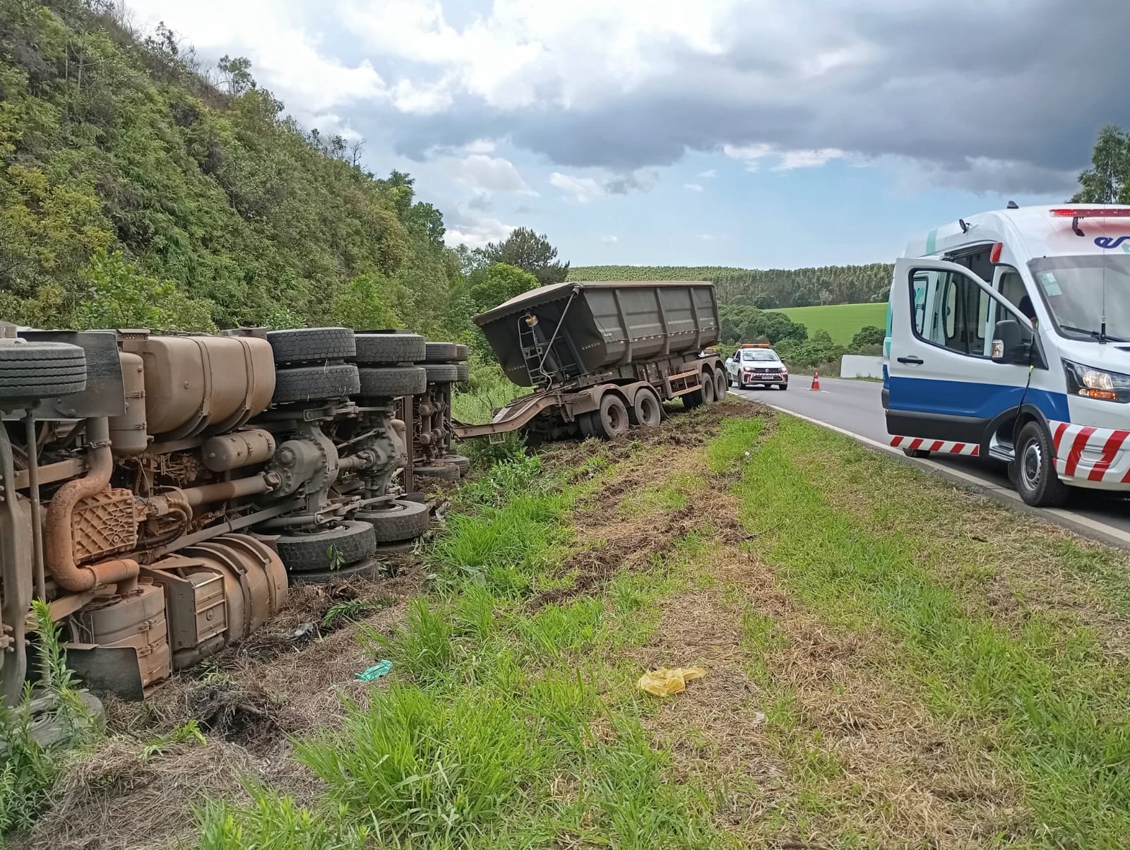 Na manhã desta terça-feira (12), um acidente envolvendo dois caminhões foi registrado na PR-092, na altura do km 205, em Arapoti, sem vítimas. A ocorrência envolveu um caminhão Volvo FH 540 com dimensões excedentes e três semirreboques, de Santo Antônio da Platina (PR), e um caminhão DAF com semirreboque, de Sombrio (SC). De acordo com a Polícia Militar Rodoviária (PMPR), o motorista do caminhão Volvo, de 54 anos, afirmou que perdeu o controle e tombou parcialmente fora da pista após o outro veículo fechar abruptamente sua faixa de direção. Ao chegarem ao local, os policiais encontraram os motoristas envolvidos em uma discussão acalorada, trocando acusações sobre a responsabilidade do acidente. Diante da situação tensa, a equipe policial acionou o delegado de polícia, que orientou a identificação dos motoristas e o encaminhamento de um Boletim de Ocorrência Unificado (BOU). O documento servirá para futuras providências legais, caso os motoristas decidam representar judicialmente.