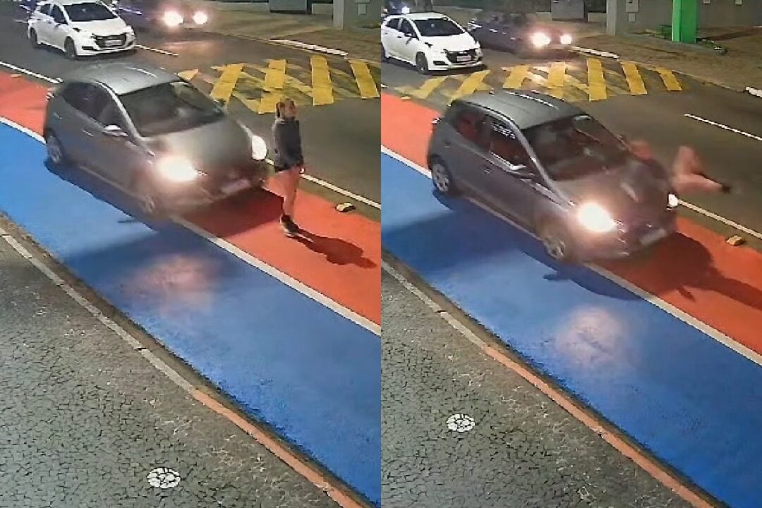 Uma câmera de segurança registrou o momento em que uma mulher foi atropelada por um carro que estava andando sobre a ciclofaixa. O caso aconteceu na noite da última sexta-feira (25), na avenida Monteiro Lobato, em Ponta Grossa, no Paraná. As imagens mostram o momento em que uma mulher está em uma ciclofaixa e conversa com o motorista de uma caminhonete que aparenta pedir informações. Em seguida, a caminhonete vai embora e a mulher permanece no local, ainda sobre a ciclofaixa, onde é permitida a presença de pessoas. Neste momento, um carro surge na parte superior da tela e vem percorrendo a faixa exclusiva. O atropelamento acontece e a mulher é lançada ao chão pelo veículo. O motorista desce do carro para prestar atendimento à vítima. Felizmente, a mulher não sofreu ferimentos graves. O teste do bafômetro do motorista deu zero, ou seja, ele não havia ingerido bebida alcoólica.