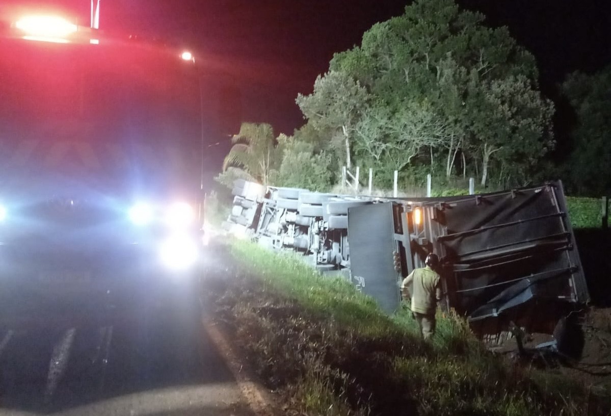 Um caminhão tombou na noite desta quinta-feira (12) após se envolver em um acidente em rodovia da região dos Campos Gerais. O caso foi registrado por volta das 21h30 e mobilizou equipes de atendimento e resgate. De acordo com informações da Polícia Rodoviária, o veículo envolvido era um Scania R460 acoplado a um semirreboque Randon, ambos com placas da cidade de Jaguaruna, em Santa Catarina. O acidente ocorreu na PR-438, no km 51+700, já no município de Ponta Grossa. Segundo dados levantados no local, o caminhão seguia no sentido Guaragi a Ponta Grossa quando acabou se envolvendo em um sinistro do tipo tombamento, parando abaixo do nível da pista, às margens da rodovia. O motorista, um homem de 27 anos, sofreu ferimentos leves e foi socorrido por equipes do SIATE, sendo encaminhado para atendimento médico no Hospital Geral Unimed. O acidente resultou em danos materiais no caminhão e no semirreboque, e as equipes realizaram a sinalização da via durante o atendimento da ocorrência.