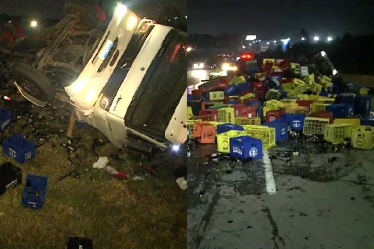 Caminhão carregado com cervejas capota e motoristas roubam a carga